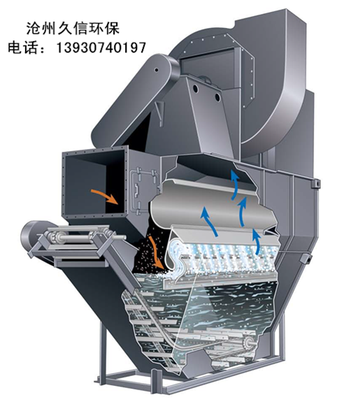 HDC濕式除塵器是利用離心力作用使水和含塵氣體徹底混合后,排除潔凈空氣。含塵氣流通過一個(gè)局部浸沒在水中的靜止葉輪片時(shí)會(huì)產(chǎn)生水幕,而灰塵在通過此水幕時(shí)被清除。HDC濕式除塵器高速通過葉輪片的氣流形成湍流水幕。在葉片底部有一專門設(shè)計(jì)的槽型口,用來補(bǔ)充額外的水到葉輪片開口的*窄的部位。通過槽型口向上流動(dòng)的水增加了灰塵與水的相互作用,從而提高了收塵效率。HDC濕式除塵器氣流方向的快速改變產(chǎn)生的離心力使粉塵穿過水幕時(shí)被*捕捉。潔凈空氣中攜帶的水分通過特別設(shè)計(jì)的除霧擋板去除。水槽內(nèi)的水反復(fù)使用,由氣流產(chǎn)生的水幕形成后,不再需要水泵或噴嘴。補(bǔ)水接頭始終補(bǔ)充少量的清水,以補(bǔ)償由于蒸發(fā)或除泥渣時(shí)帶走的水。