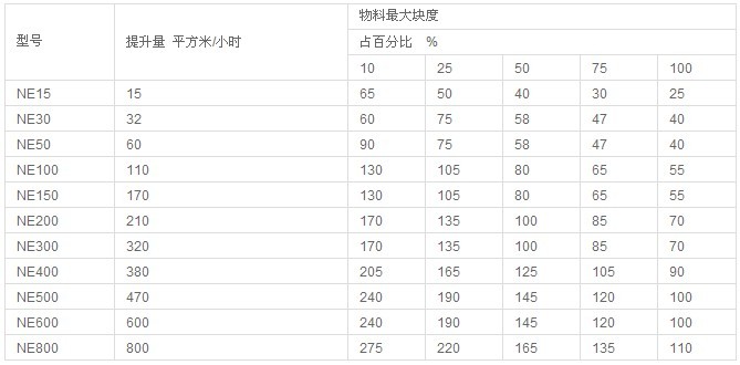 板鏈斗式提升機(jī)系流入式喂料,物料流入料斗內(nèi)靠板鏈提升到頂端,在物料重力作用下自行卸料。板鏈斗式提升機(jī)規(guī)格多(NE15~NE800共11種)提升量廣;且生產(chǎn)能高,能耗較低,可逐步代替其他類型提升機(jī),其主要參數(shù)見下表。板鏈斗式提升機(jī)采用全封式機(jī)殼鏈速低,幾乎無回料現(xiàn)象,因此無功功率損耗少,噪聲低,壽命長(zhǎng)。